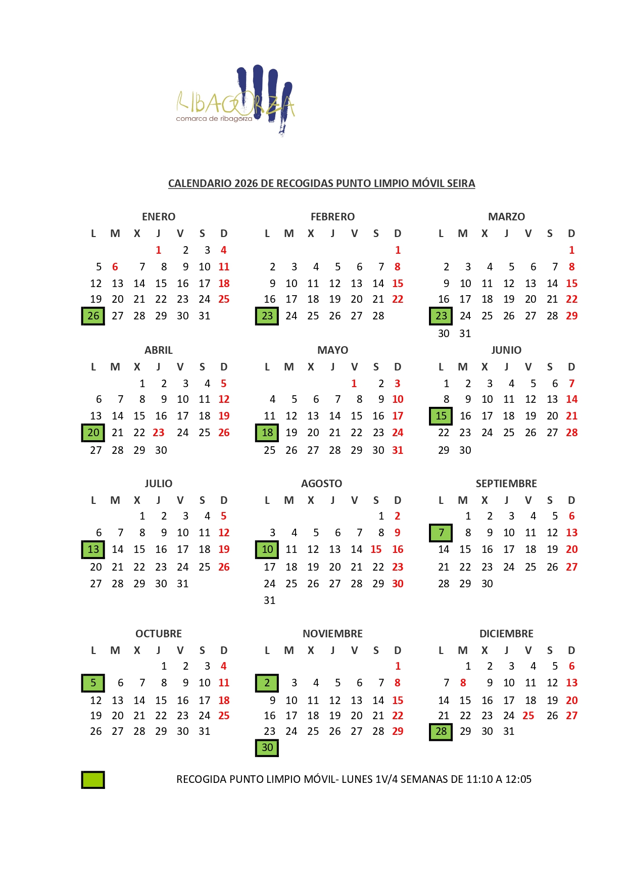 Calendario Punto Limpio Móvil - Seira 2026 Whatsapp: Calendario Punto Limpio Móvil - Seira 2026 Fecha 13 enero 2026 Comarca de Ribagorza (residuos)