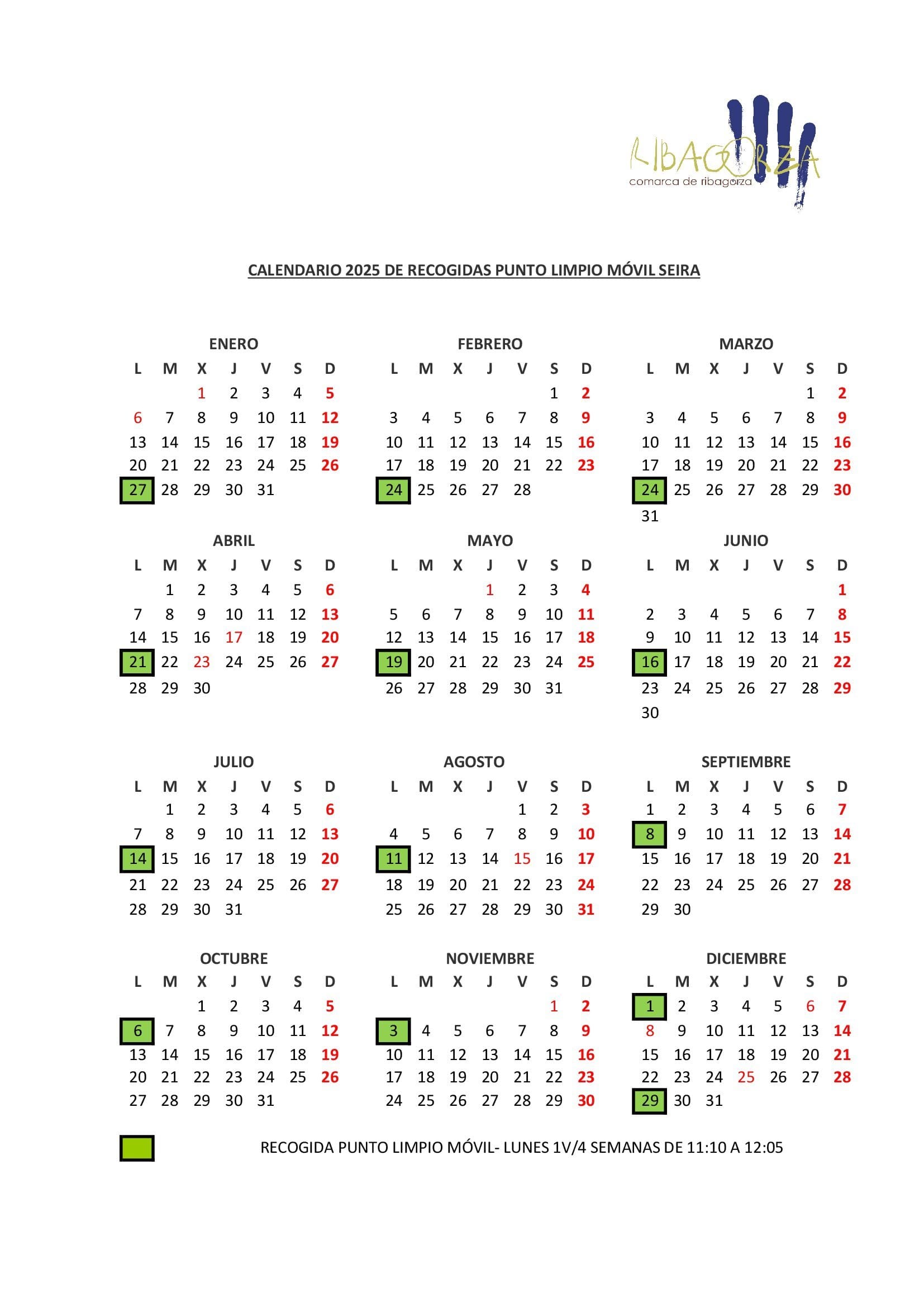 Calendario 2025 Recogida punto limpio MÓVIL SEIRA